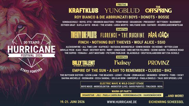 Das Hurricane Festival findet vom 19. bis 21. Juni 2026 statt – und feiert 30. Geburtstag! Der Vorverkauf ist gestartet, die ersten neun Acts für das Line-up sind bereits bestätigt.