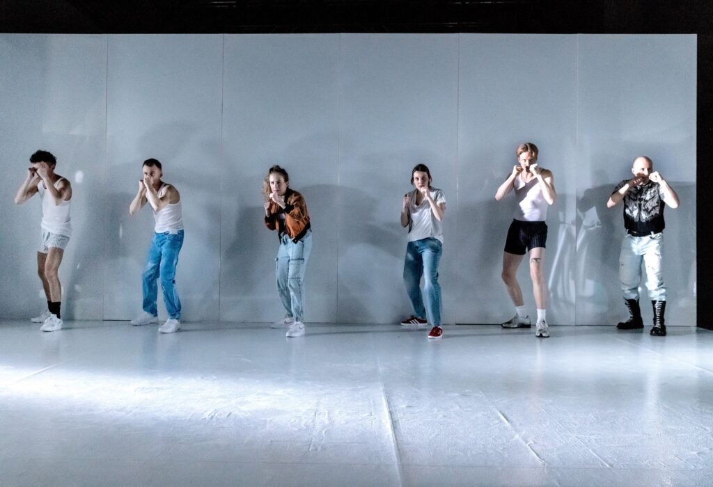 Selten war eine Aufführung so „banal“ und verstörend zur selben Zeit. Denn eigentlich ist es ja „nur“ der Alltag des jugendlichen Hendriks, der hier von sechs Student:innen vor den Augen etwa 150 Menschen auf die Bühne gebracht wird. Das Bühnenbild besteht bis auf die großen weißen Leinwänden im Hintergrund, einer Kleiderstange neben der Bühne und ein paar wenigen Requisiten wie Plastiktüten, Esslöffel und Boxpratzen (das sind diese Boxhandschuhe, auf die man draufschlägt) nur aus den Schaupieler:innen selbst. Die Besonderheit: Niemand ist hier so richtig Haupt- oder Nebenrolle. Stattdessen schlüpft jeder zeitweise in die Rolle des Ich-Erzählers – eine sehr erfrischende Art des Geschichtenerzählens. Und gemeinsam fesseln die sechs Akteur:innen das gesamte Publikum so sehr im Geschehen, dass ich mich plötzlich selbst dabei erwische, wie ich beim vermeintlichen „Gas ziehen“ auf der Bühne langsam ein- und ausatme oder sich mir der Magen völlig umdreht, als Susanne, gespielt von Annika Hauffe der Kindergärtnerin den Brei wieder entgegen kotzt. Wie wohl die Schulklasse über all das denkt, die sich ebenfalls im Publikum befindet?
